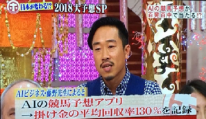 2018年1月10日 / 最終更新日 : 2018年7月17日 gauss_pr メディア掲載 【フジテレビ「ホンマでっか!?TV」1 月10日放送分】 弊社AI公営競技予測サービス「SIVA」が紹介されました。 株式会社GAUSS(本社:東京都渋谷区、代表取締役:宇都宮 綱紀、以下「GAUSS」)は、当社AI公営競技予測サービス「SIVA」がフジテレビ系列で2009年10月19日から放送されている情報トークバラエティ番組「ホンマでっか!?TV」に紹介されました。 ■以下、紹介された実際の画像 Facebooktwitter